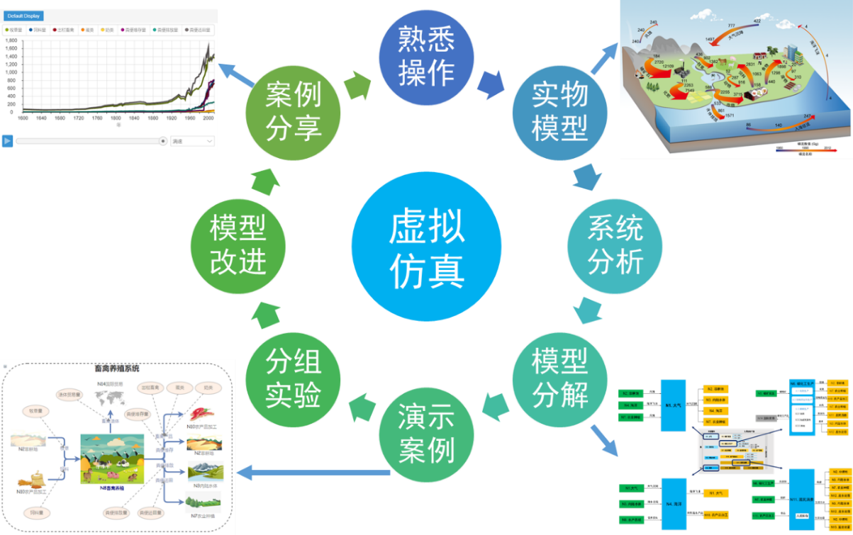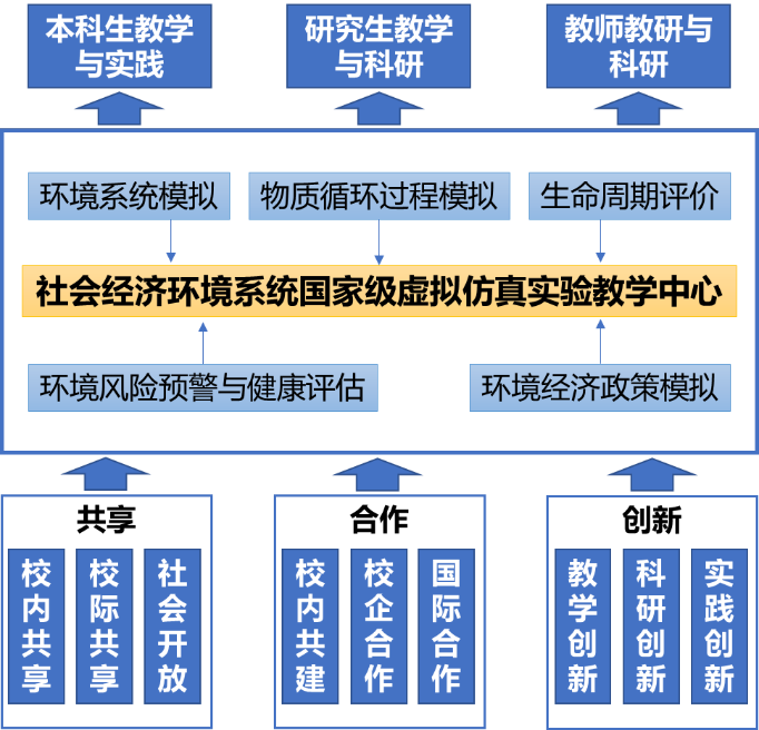 中心建设了丰富的学科交叉融合虚拟方针教学资源,制定了一系列可操作的开放实验教学和管理规章制度,初步形成了以虚拟仿真实验为主体的教学质量监督体系。中心可开设涵盖水环境、大气质量环境等多方面、10多个环境系统虚拟仿真实验项目,不但成为本科生相关课程的教学工具,而且成为研究生和教师科研的究平台,更为大学生创新计划、挑战杯创业大赛等本科生创新实践活动提供了强有力的支撑。中心研发的"物质循环过程虚拟仿真实验"项目被评为2018年国家级虚拟仿真实验教学项目,用于帮助学生针对区域物质循环过程中的资源环境问题开展动态虚拟仿真实验。