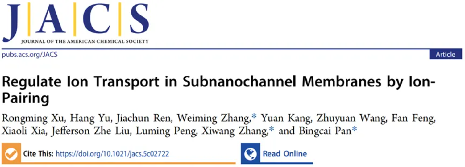 该研究工作以"Regulate Ion Transport in Sub-nanochannel Membrane by Ion-pairing"为题,发表在知名学术期刊Journal of the American Chemical Society上(原文链接://pubs.acs.org/doi/10.1021/jacs.5c02722)。团队博士后许荣明为论文的第一作者,张炜铭教授、张西旺教授(昆士兰大学)、潘丙才教授为通讯作者,团队博士生余航、硕士生任佳纯、莫纳什大学博士后康源、昆士兰大学博士后王祝愿、墨尔本大学刘哲教授、博士生冯帆、茄子视频 化学化工学院彭路明教授、博士生夏晓丽为共同作者。研究得到了国家自然科学基金(U22A20403, 21925602)、澳大利亚研究理事会ARC未来学者研究基金(FT210100593)、上海同济高廷耀青年博士生杰出人才奖学金以及中国科学院生态中心奥加诺(水质与水环境)奖学金资助。