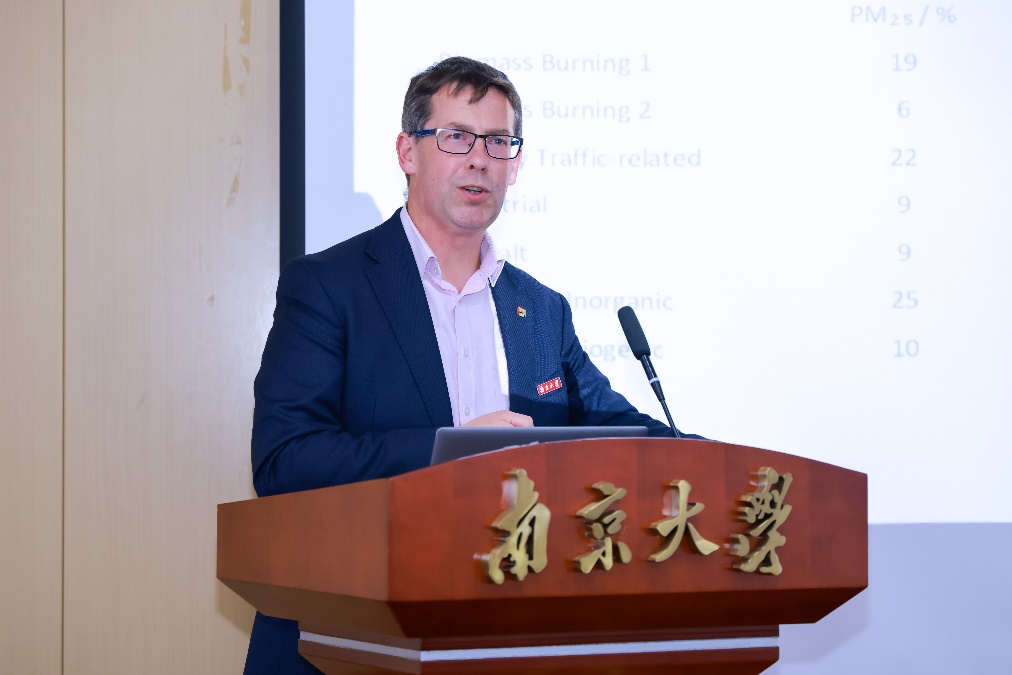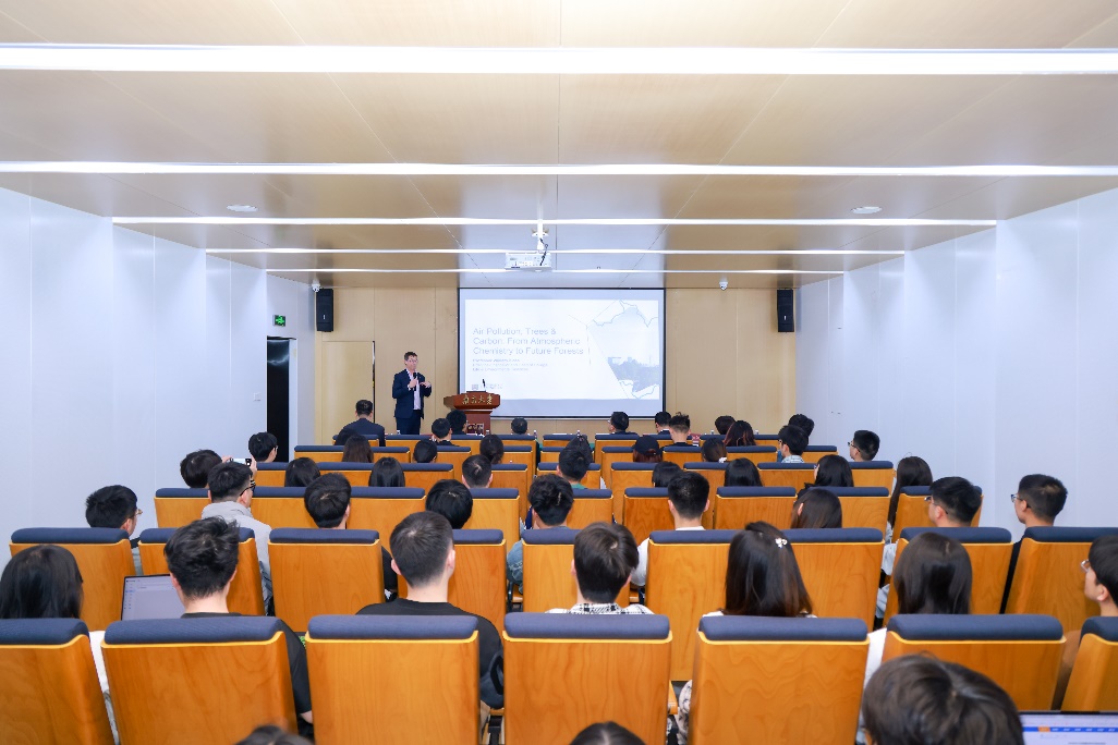 聘任仪式后,威廉・布洛斯教授做了题为"Air Pollution, Trees and Carbon —— from atmospheric chemistry to future forests"的学术报告。他系统介绍了其研究团队在森林碳储存、大气硝酸盐颗粒物对臭氧形成影响等方面的突破性发现。报告现场座无虚席,师生们就大气硝酸盐气溶胶生成机制、碳中和政策的环境公平性等问题与威廉・布洛斯教授展开热烈讨论。