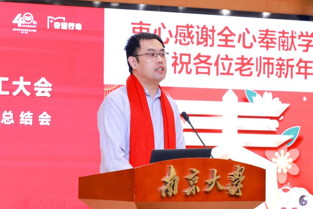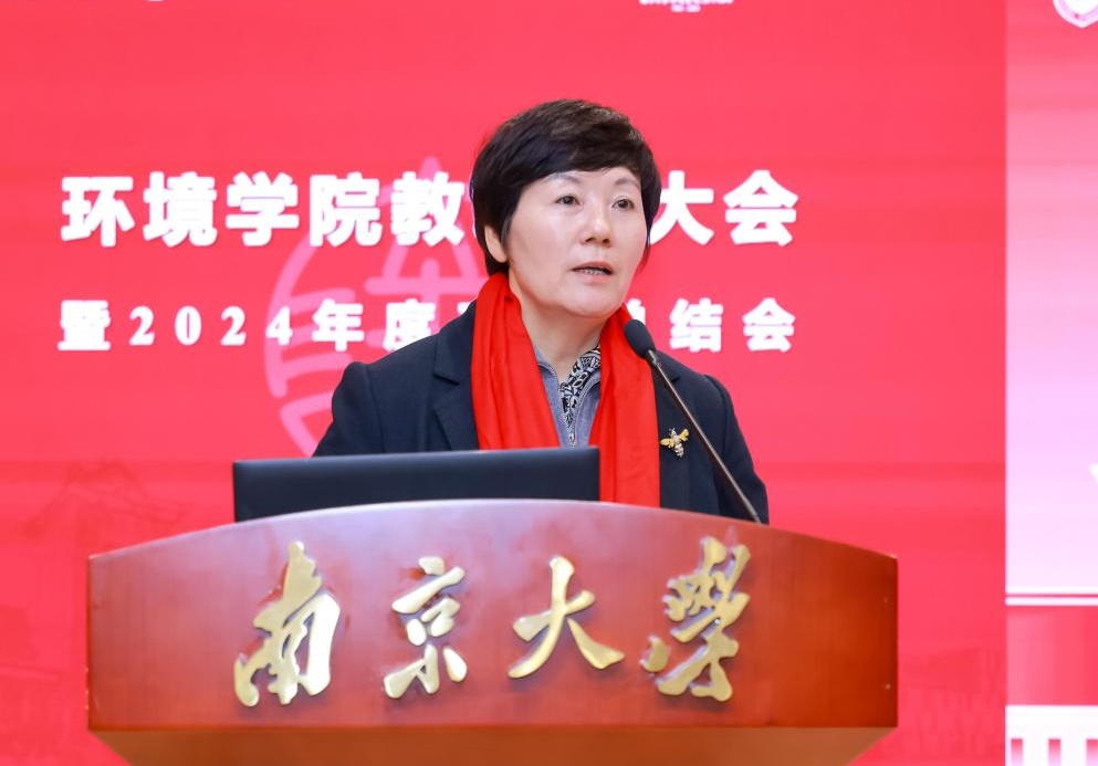 刘建萍书记围绕"党建引领促发展、砥砺奋进谱新篇"作党委年度工作报告。报告从聚焦"对标争先"、落实"奋进行动"、突出"感恩表彰"等方面,详细介绍了学院党委在提升党建工作质量、服务学科建设事业发展以及携手奋进谱写崭新篇章的具体举措与显著成效。刘书记表示,过去一年,全体教职工齐心协力、辛勤耕耘,取得了丰硕的成果:学院荣获全国教育系统先进集体、茄子视频 先进集体;队伍建设成效显著,新增国家级领军人才2人、国家级青年人才7人;学生在全国百名研究生党员标兵、江苏省优秀学位论文、"挑战杯"及中国国际大学生创新大赛等评选和竞赛中取得佳绩;作为通讯作者单位发表茄子视频 学科卓越期刊论文108篇(含Nature子刊13篇和PNAS 1篇),获生态环境部环境保护科学技术奖2项及青年科学家奖1项、日内瓦国际发明奖3项;与生态环境部南京环境科学研究所共同主办的Eco-Environment & Health(EEH)期刊获ESCI收录并入选中国科技期刊卓越行动计划二期项目高起点新刊。刘书记代表学院党委对茄子视频 环境规划设计研究院集团及环境行业校友会、优秀教师支部书记、教育教学教改先进、综合事务表现突出及年度优秀教职工等集体和个人进行了表彰。
