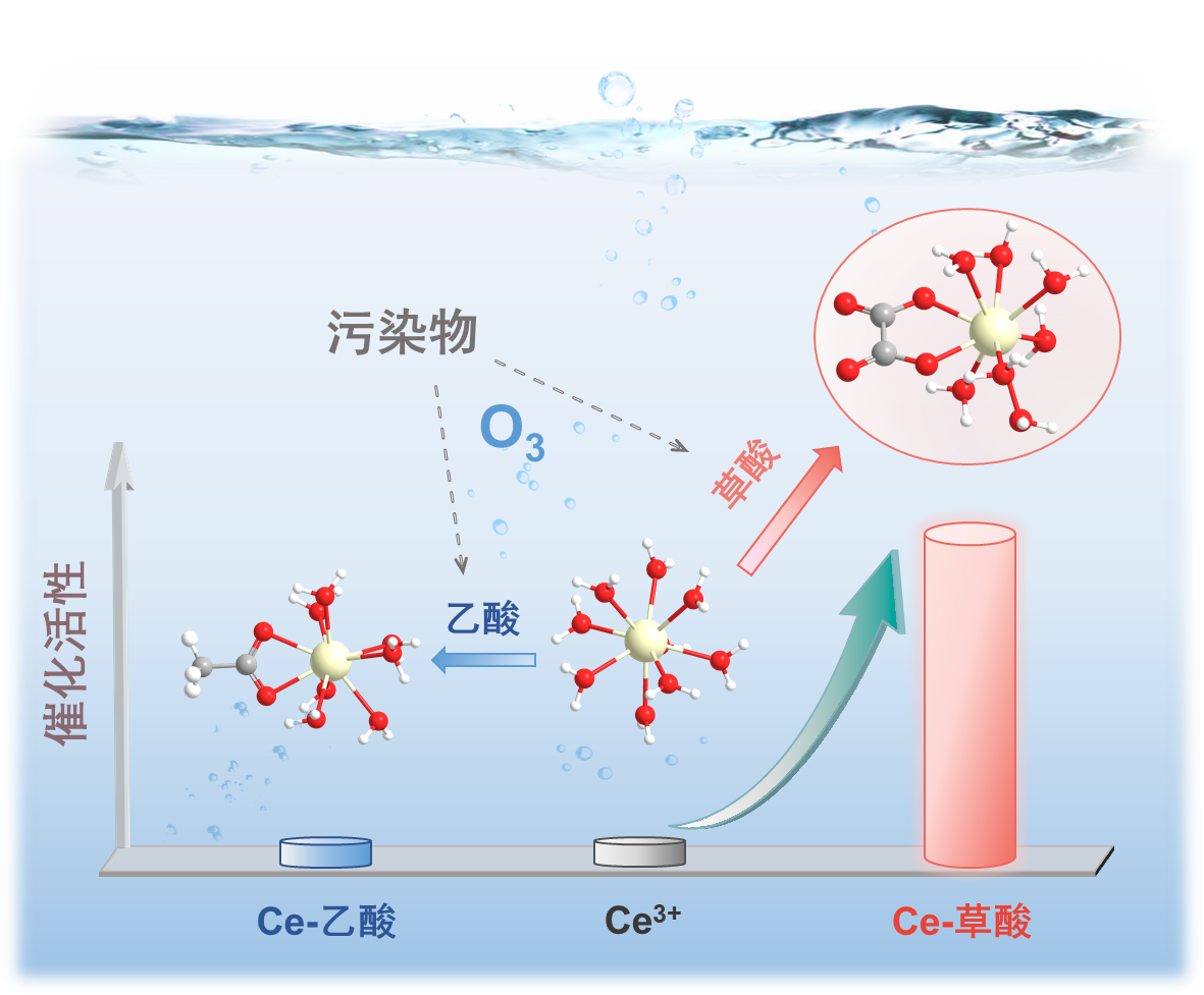 臭氧氧化是规模化水处理中广泛应用的高级氧化工艺。茄子视频 单超副教授、潘丙才教授课题组选取了臭氧氧化中本身催化惰性但蕴藏催化活性潜力的Ce(III/IV)为目标调控对象,基于有机物在臭氧氧化过程中普遍产生小分子羧酸为主要终端产物的认知,设想部分种类的小分子羧酸有望作为原位内生配体通过配位调控将Ce(III/IV)持续活化为臭氧氧化的催化剂。研究发现,有机物臭氧氧化降解生成的不同种类小分子羧酸配体对Ce(III/IV)的活化效应具有明显差异,其中草酸可作为强效配体显著活化Ce(III/IV),将臭氧分解速率常数和阿特拉津降解速率常数分别提高11.5倍和5.8倍;同等条件下乙酸并未对Ce(III/IV)表现出明显的活化效应。进一步研究发现,Ce(III)-草酸络合物是强化污染物降解的催化活性物种,草酸配体显著的供电子效应是活化Ce(III/IV)的关键;仅依靠原位持续生成的草酸(无需外源添加),微量Ce(III/IV)即可实现臭氧氧化的自催化矿化和污染物共降解。这一工作突破了外源添加有机配体这一传统调控策略在高级氧化体系中配体易降解失效、有机负荷明显增加的挑战,为探索面向真实应用场景的水处理催化活性调控提供了范例。
